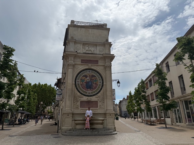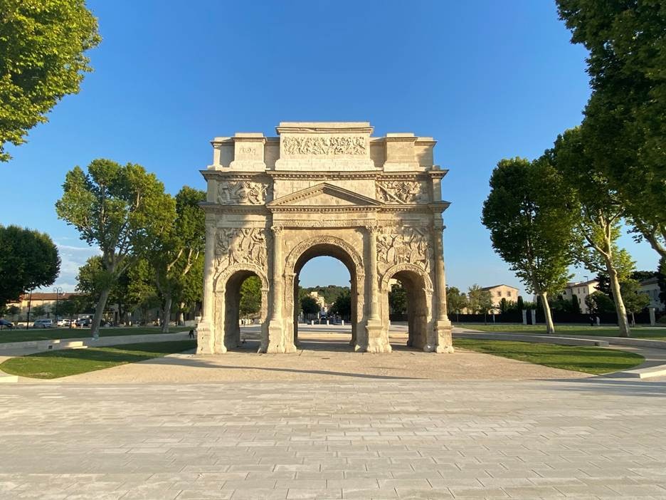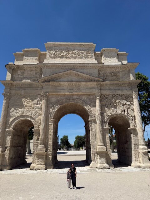 Just outside the historic center (a bit of a hike but worth the walk) stands the Triumphal Arch of Orange, built in the early 1st century CE to honor Roman veterans and military victories. Covered in intricate reliefs of armor, weapons, and battles, it quietly marks Orange as an important Roman crossroads—less flashy than some sites, but still super cool and a lot easier to get up close and see than other similar monuments, like the Arch of Constantine in Rome. This one is just out in the open to see and touch, and we all were quite impressed.